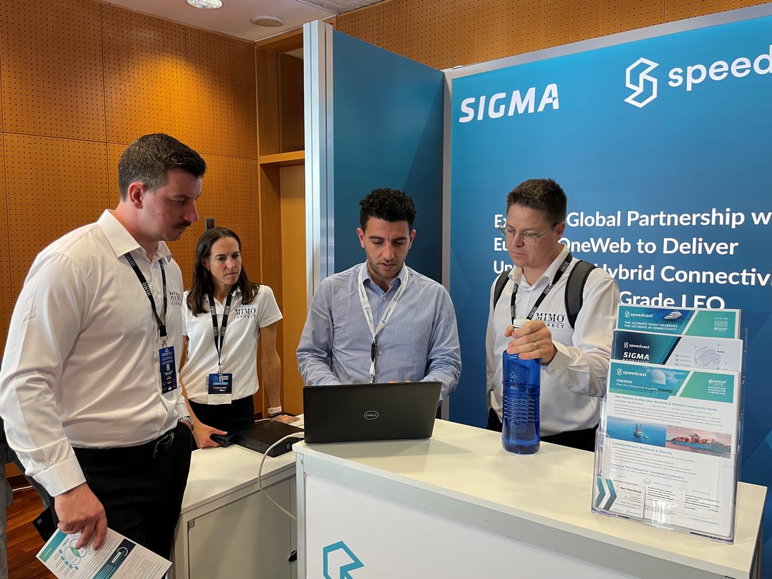 A team member demonstrates Speedcast SIGMA for stand visitors during Superyacht Technology Show