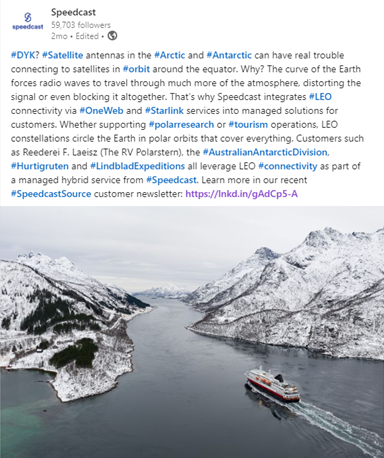 Did you know? Our customers such as Reederei F. Laeisz, Australian Antarctic Division, Hurtigruten and Lindblad Expeditions all leverage LEO connectivity as part of a managed hybrid service from Speedcast. Learn more.